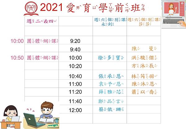 附上 學前班 "2020 12月 2020 1 月 2021 2月" 的網課時間表,